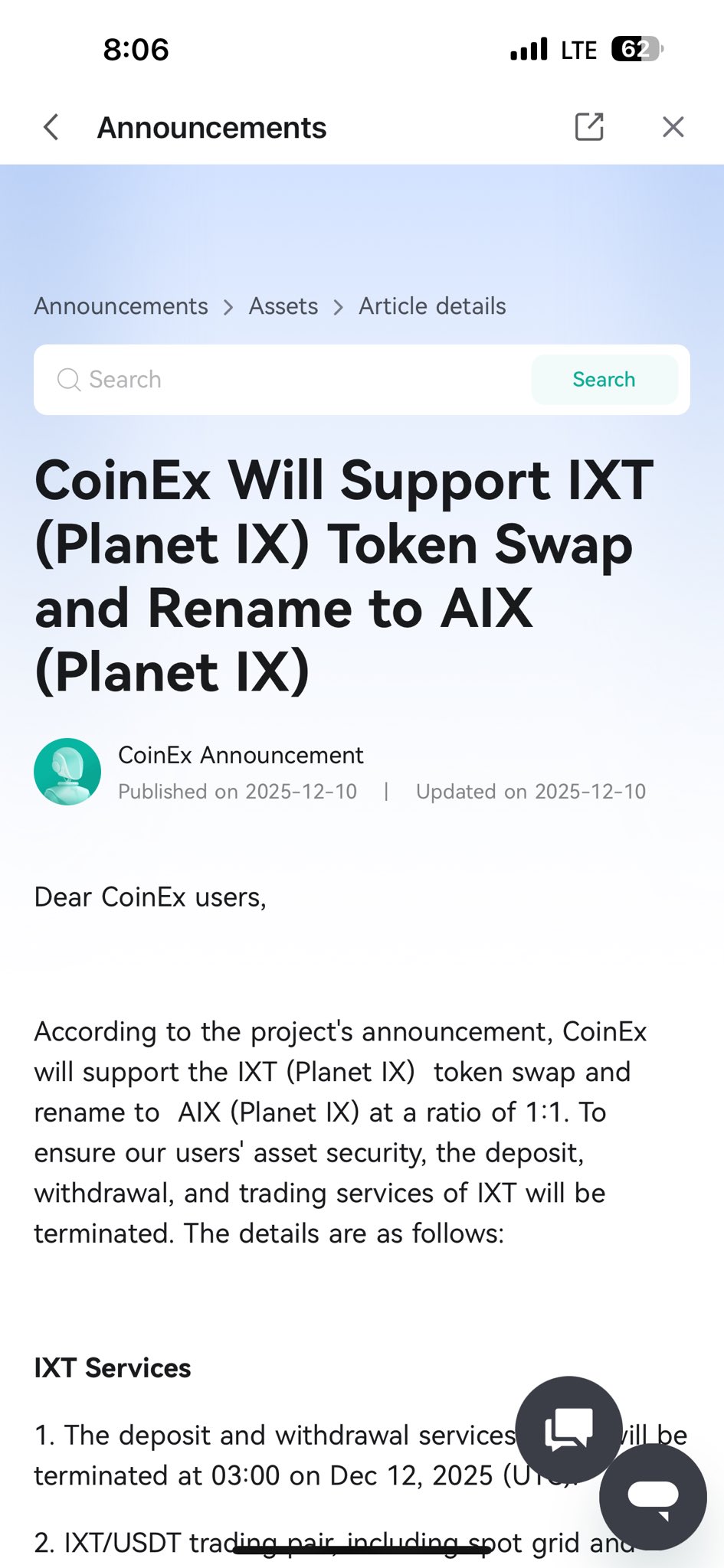 CoinEx has announced full support for the IXT (Planet IX) token swap to AIX at a 1:1 ratio.
