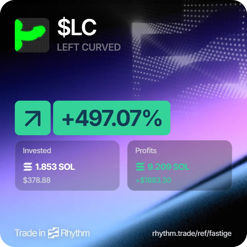 The tweet shows a huge gain of nearly 500% through the $LC token on the Trade in Rhythm platform, implying excellent performance of the platform or the token.