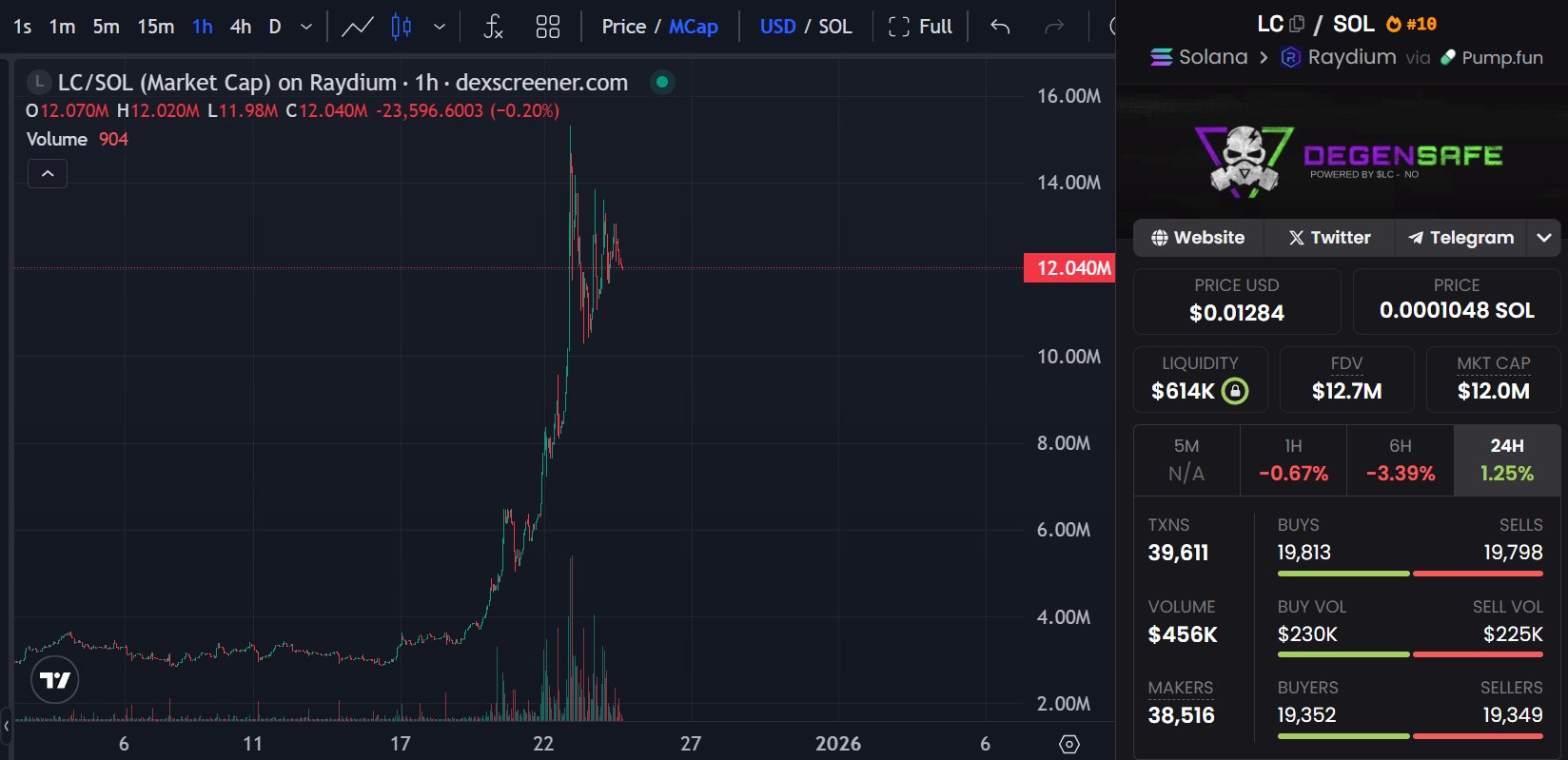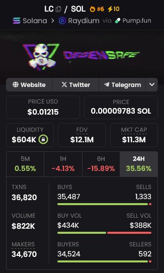 NEW: $LC from @degensafefun is up 35.56% in the past 24 hours, briefly breaking the $15 million mark.