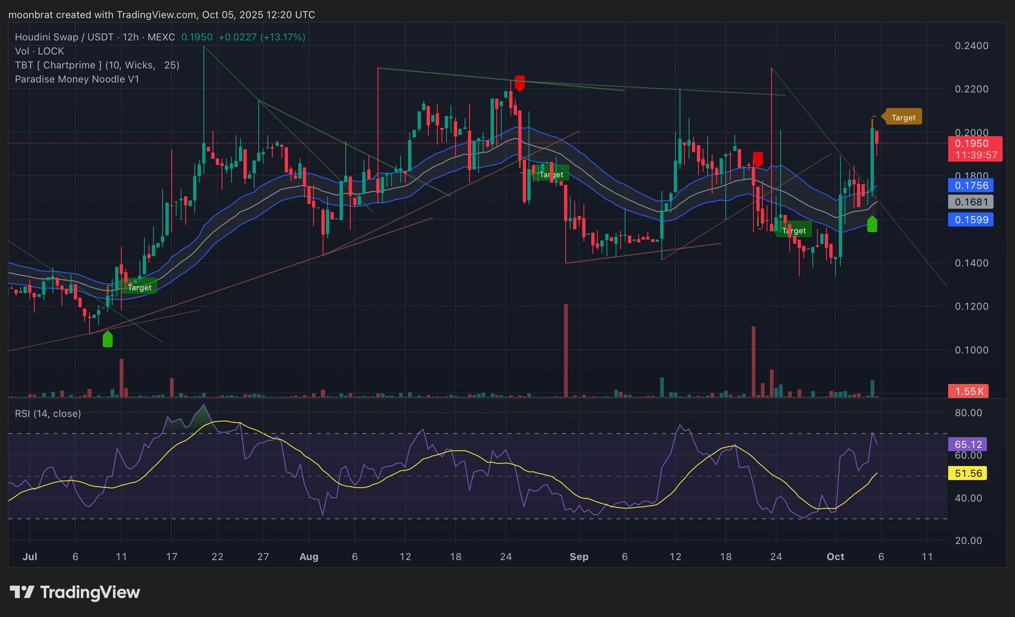 When deciding whether it’s a good time to buy or sell Houdini Swap (LOCK), it’s important to first align with your own trading strategy and risk profile.Long-term investors and short-term traders often interpret market conditions differently, so your decision should reflect your personal approach. According to the latest LOCK 4-hour technical analysis, the current trading signal is Продать. According to the latest LOCK 1-day technical analysis, the current signal is Hold.