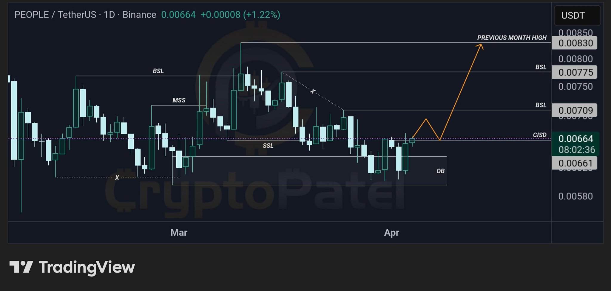 PEOPLE technical analysis shows bullish continuation, target price 0.00830.