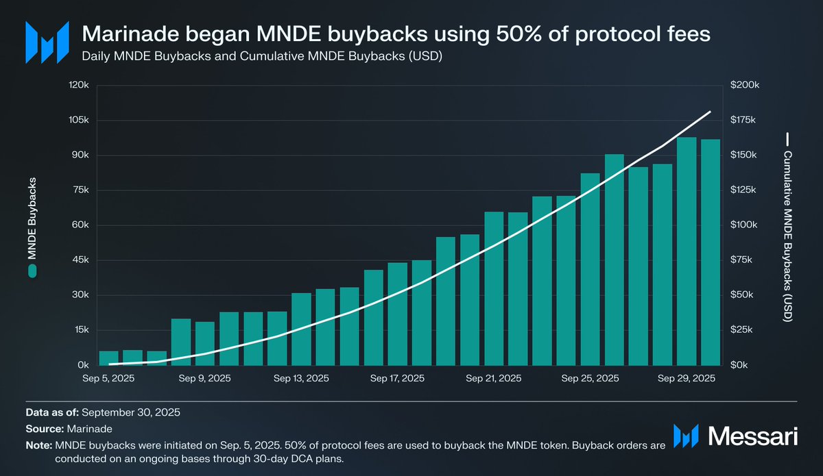 In Q3’25 @MarinadeFinance initiated $MNDE buybacks, marking the first quarter where protocol revenue accrued directly to the MNDE token.