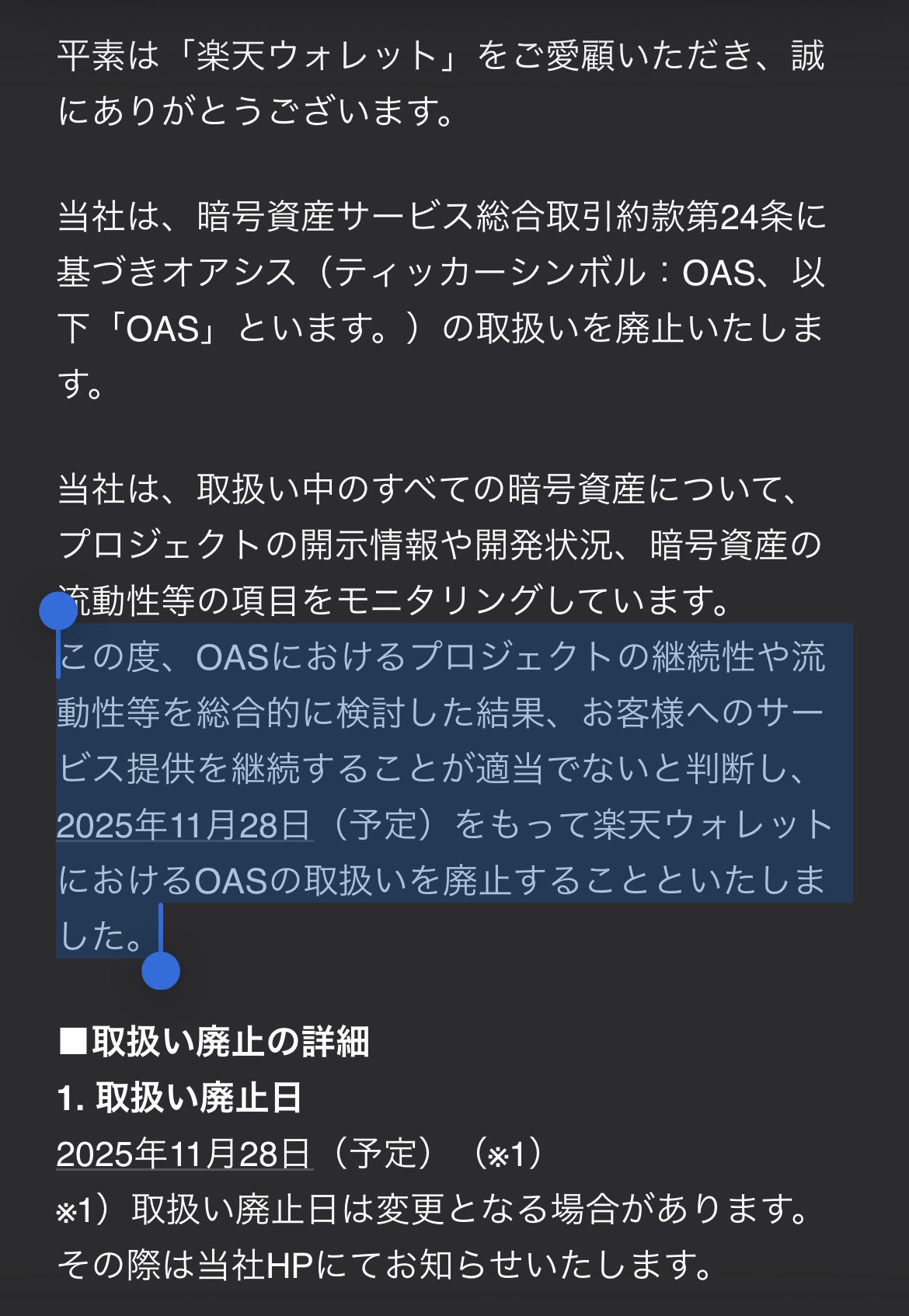 > As a result of comprehensive consideration of the project's sustainability, liquidity, etc., for OAS, we have determined that it is not appropriate to continue providing services to customers, and therefore, we have decided to discontinue the handling of OAS on Rakuten Wallet. https://t.co/kWoaFStwG2