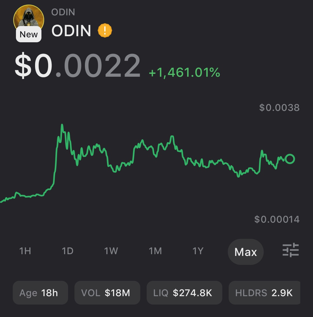The author is bullish on $ODIN and has bought it due to CZ's attention and large investor purchases, expecting a short-term rise, but the token has surged over 1400% in just 18 hours since its launch.