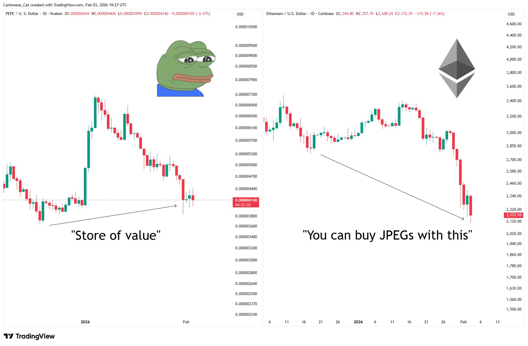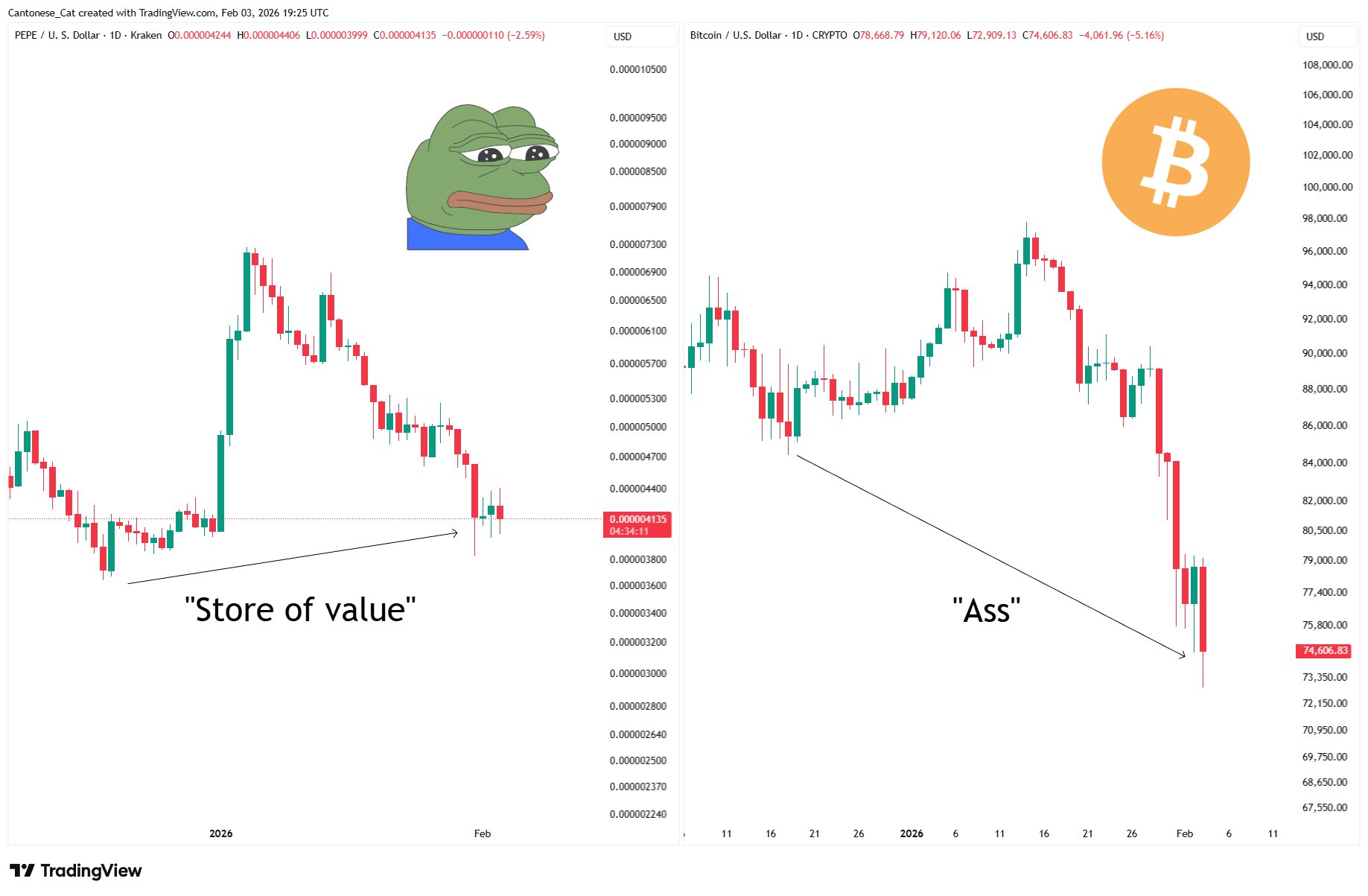 The author finds the BTC trend absurd and frustrating, expressed with a sad Pepe image.