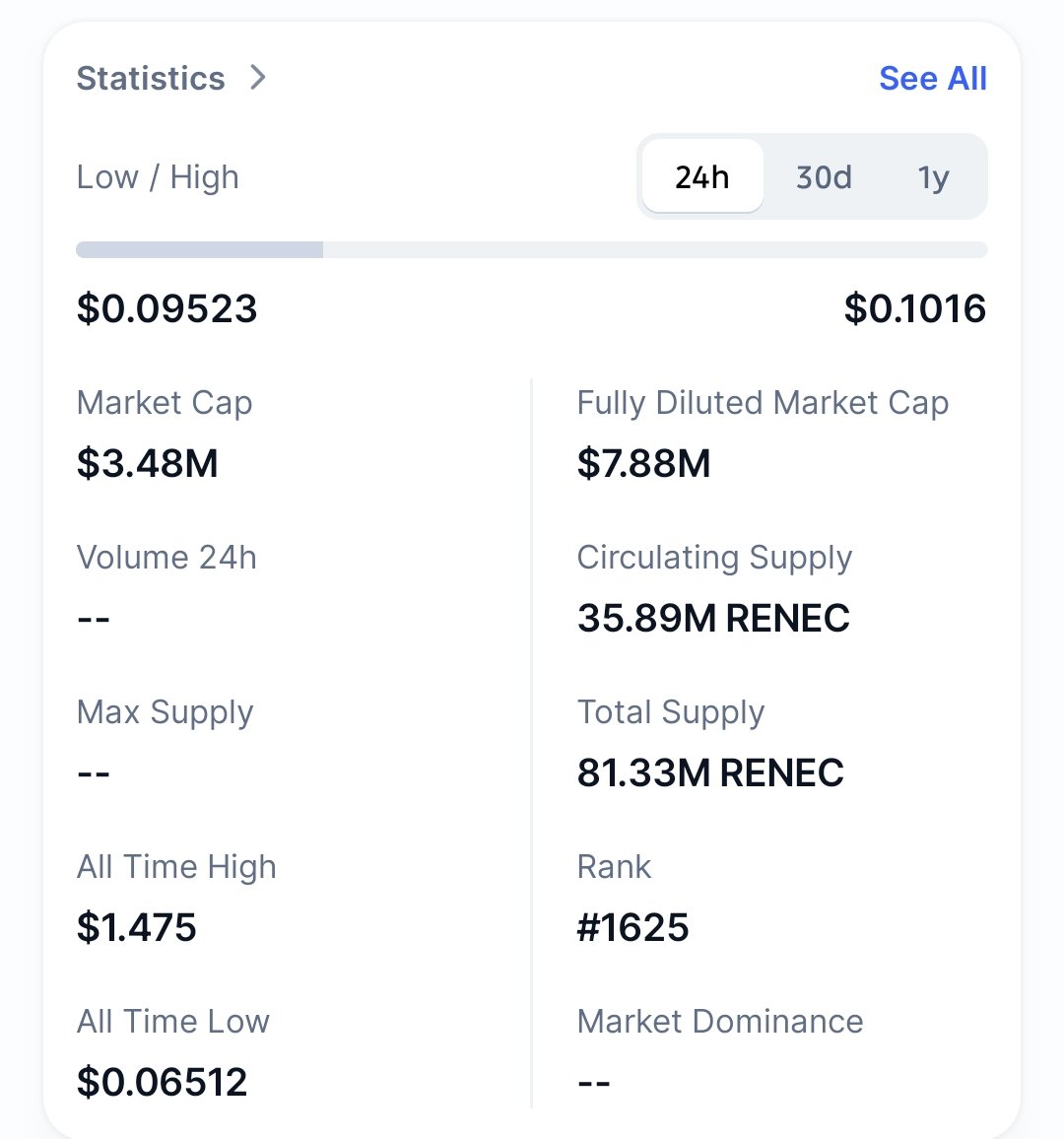 Today's price of RENEC Is $ 0.049 (RENEC/USD). With A Market Cap Of $ 1.79M USD. 24-Hour Trading Volume Of $ 0 USD, A 24-Hour Price Change Of +0.00%, And A Circulating Supply Of 35.90M RENEC.