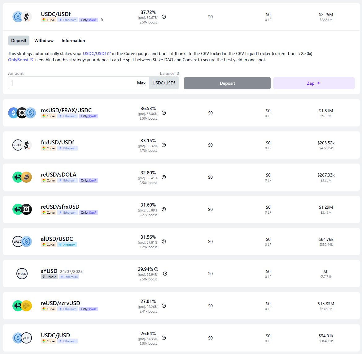 The author is re-focusing on StakeDAO's LP opportunities, advising to pay attention to underlying TVL and the entry/exit costs of exotic stablecoins.