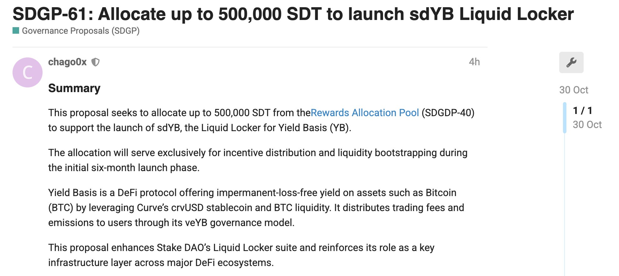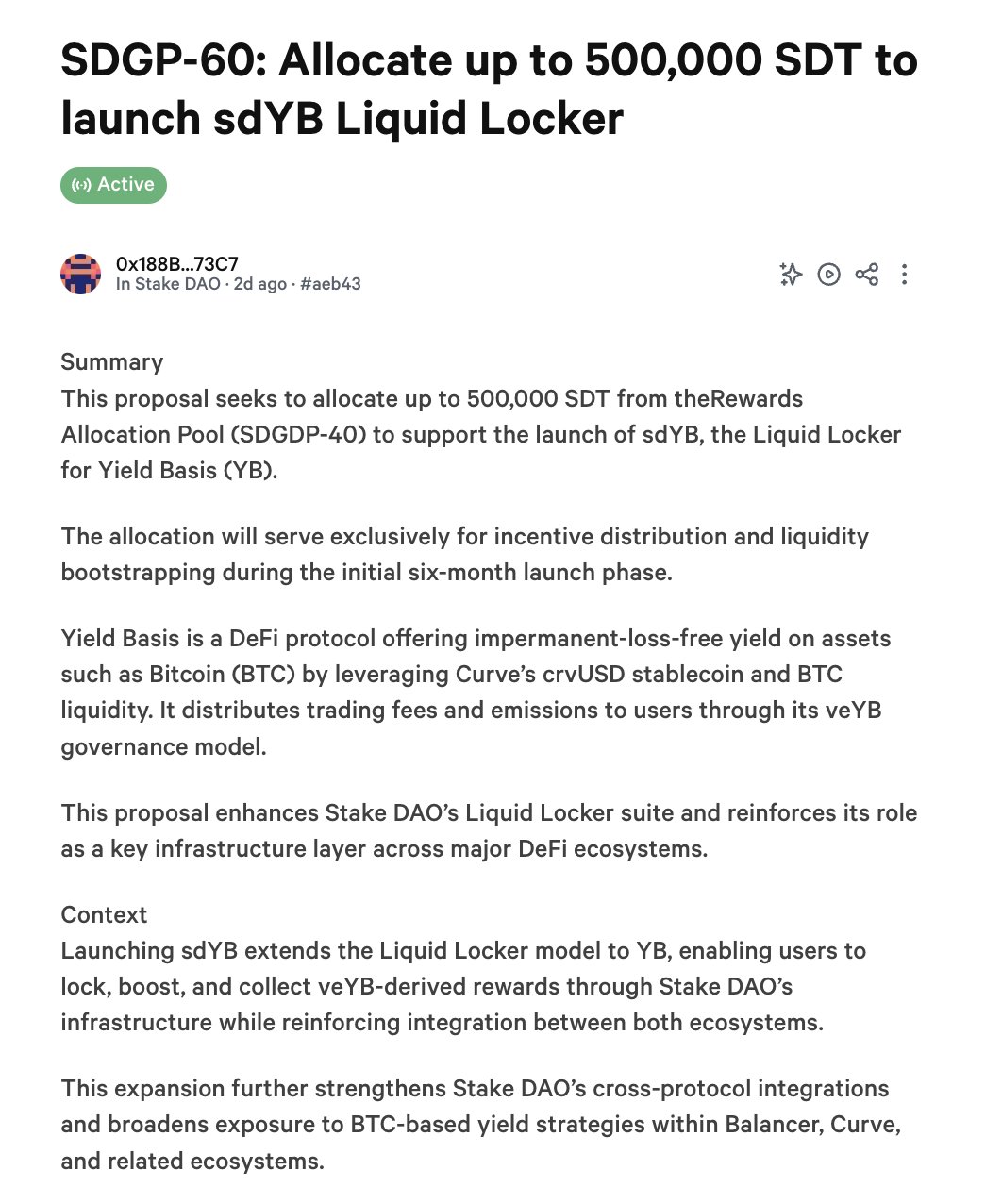 Stake DAO proposes allocating 500,000 SDT to support the launch of Yield Basis's sdYB Liquid Locker, enhancing DeFi ecosystem integration.
