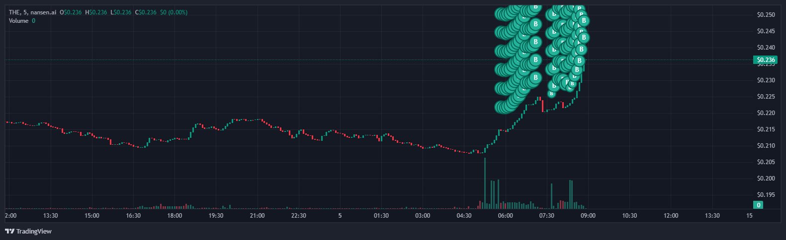 A prominent wallet continues to buy large amounts of $THE, driving the price up, with strong buying pressure.