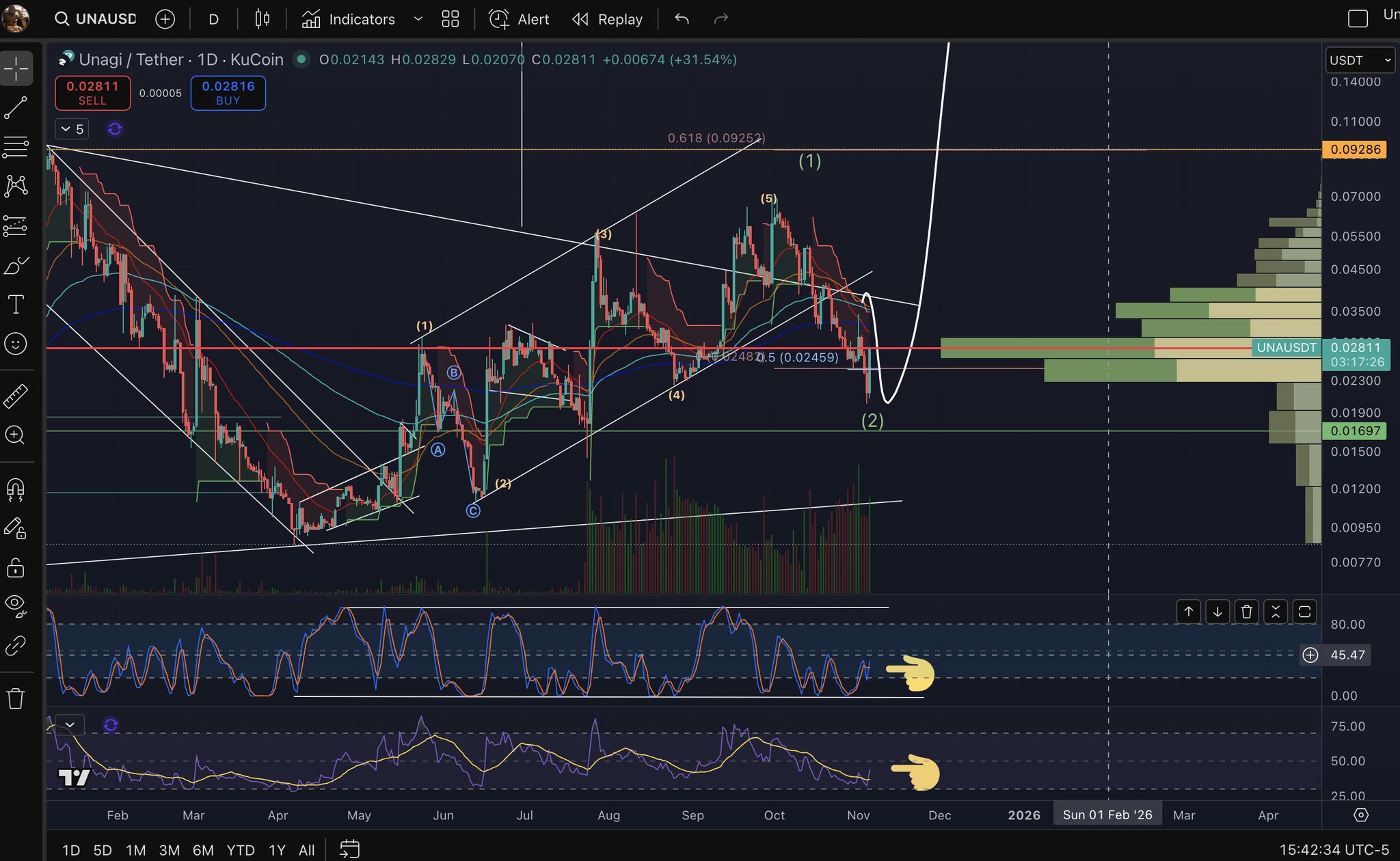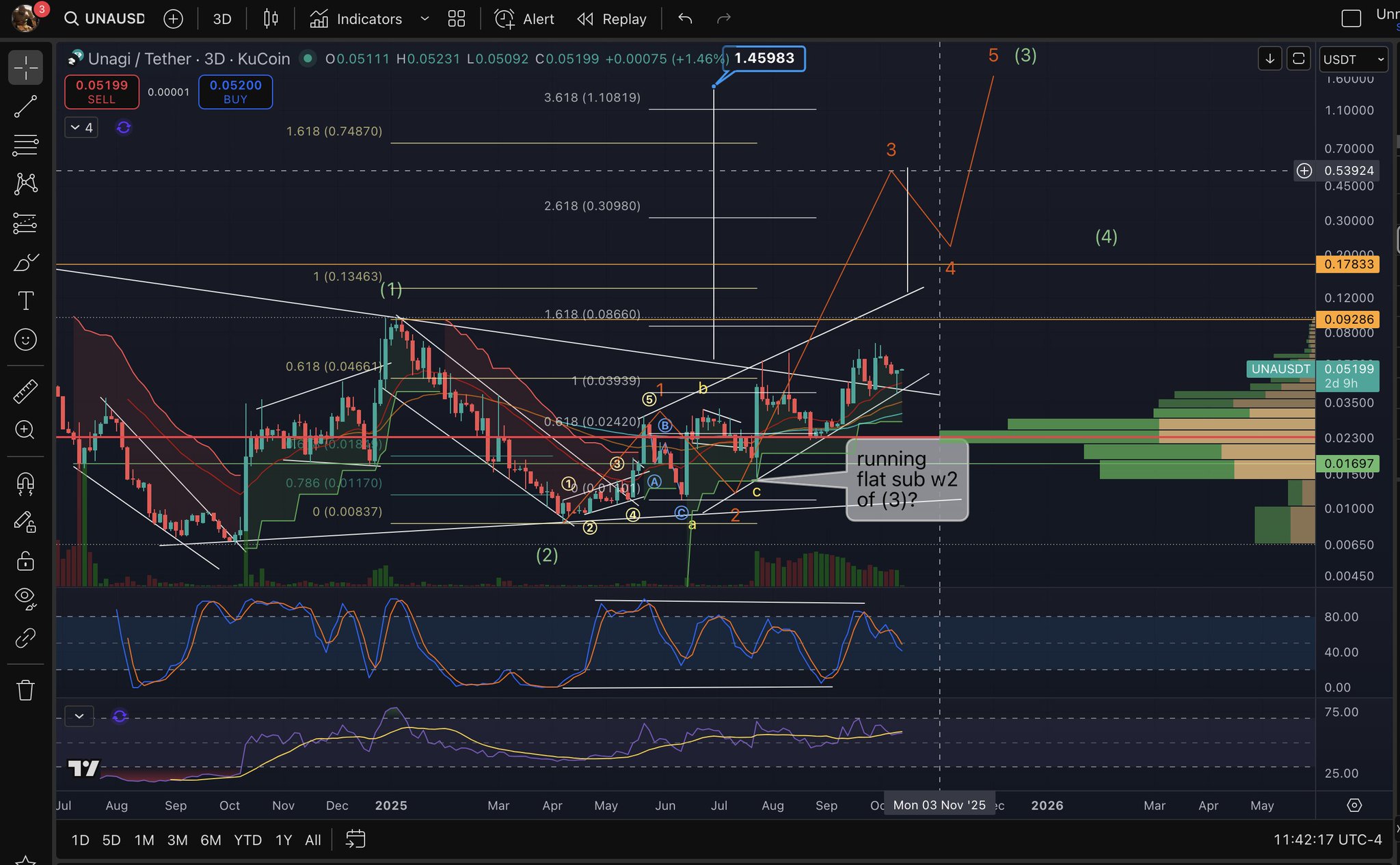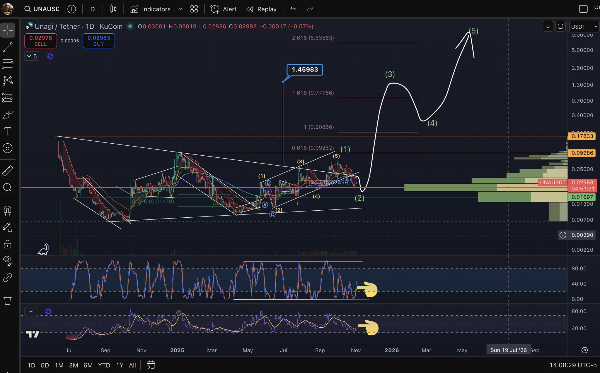The tweet and chart show extremely bullish expectations for UNA, predicting a significant surge based on Elliott Wave Theory.