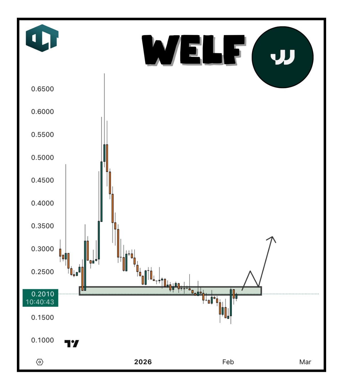 WELF is attempting to break out of a long-term downtrend, currently testing resistance at $0.20, with a post-breakout target of $0.30.
