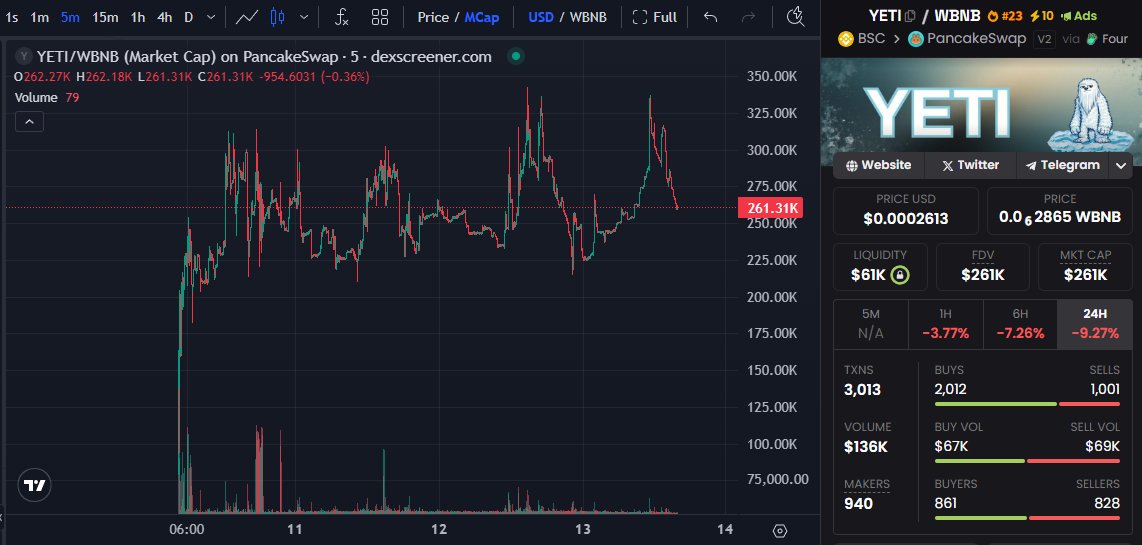 Heard there is also quite a bit of volume on the BSC meme market. Take $YETI | @YETI_BNB here for example. Launched a few days ago and holding up pretty well. Looks ready for another leg up👀.