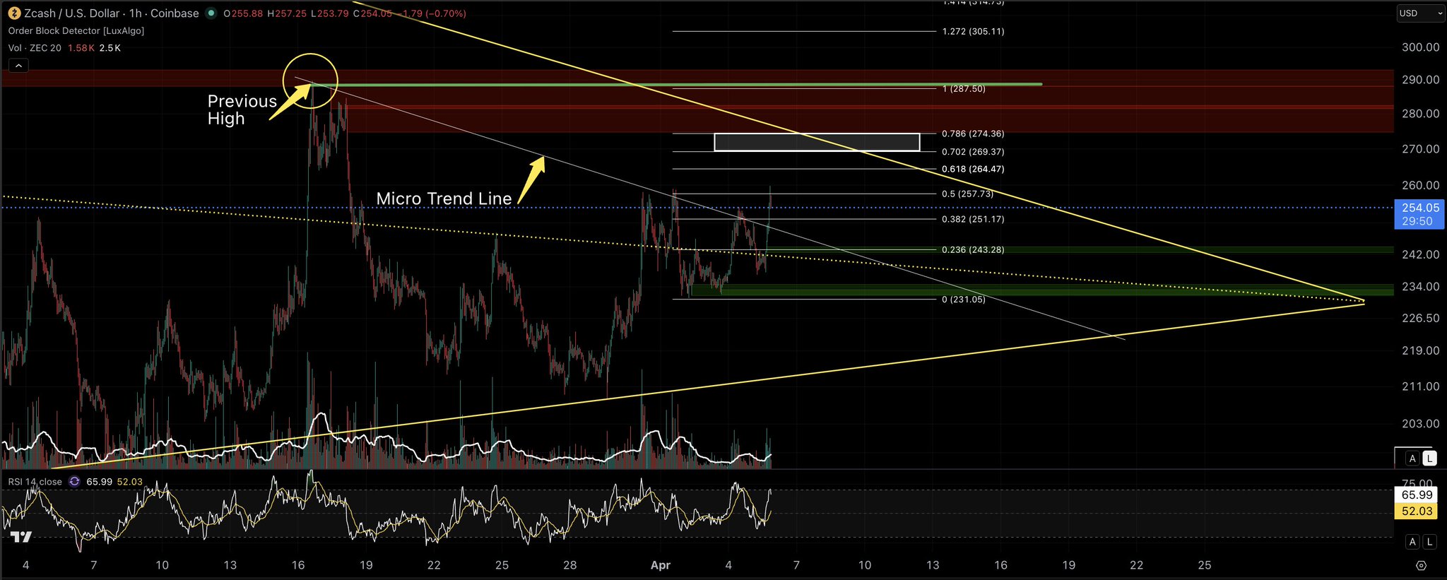 #ZEC finally pushed through the descending, micro trend line shown. It needs to hold that line to be able to push up to the macro structure upper rail in confluence with the .702 and .786 fib levels.