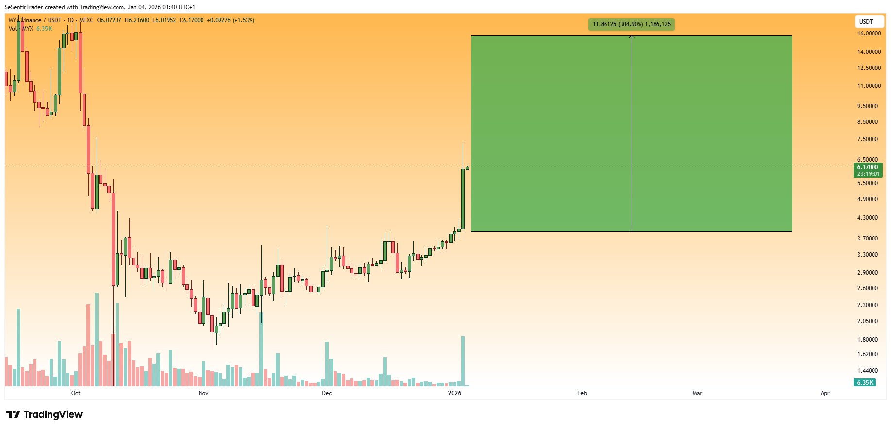 43 1 4.61K Оригінал >Тенденція MYX після випускуНадзвичайно бичачийThe author celebrates MYX's successful prediction, with the price soaring over 700% after reaching the target zone.