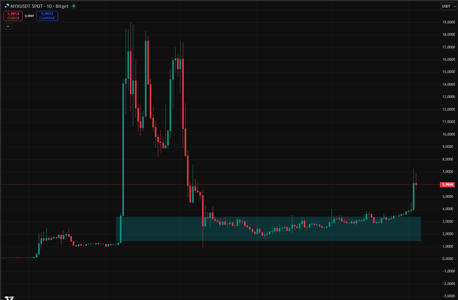 Tryrex TA_Analyst Trader S23.85K @Tryrexcrypto$MYX just WOKE UP Printed a +50% daily candle Watching this coin very closely. Might be the beginning of a run back to the highs. Waiting for confirmation though. We'll see if $MYX slowly consolidates in the coming hours or not. https://t.co/A6RkVGScjj