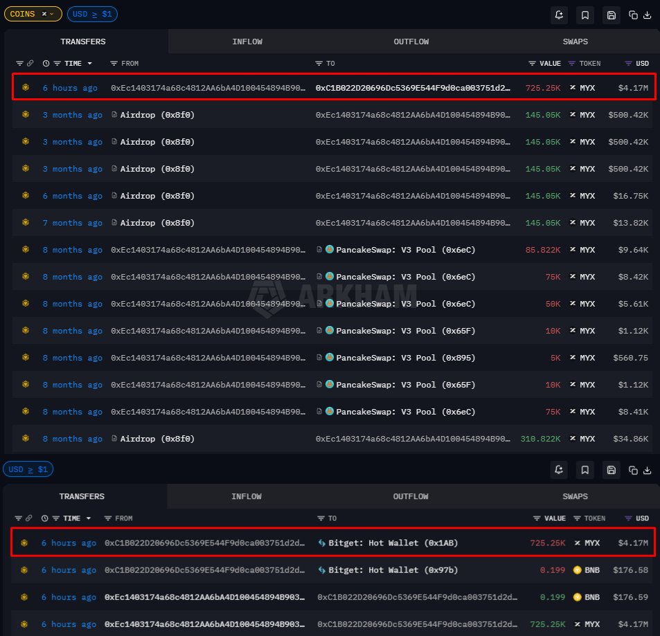 onchainschool.pro OnChain_Analyst Educator A6.03K @how2onchain$MYX TEAM WALLET MOVE One of the team wallets, which had received $MYX from the airdrop, transferred all tokens to Bitget 6 hours ago The total value of the transfer was $4.2M Wallet: 0xEc1403174a68c4812AA6bA4D100454894B9030aE https://t.co/nLwpEWpCZM