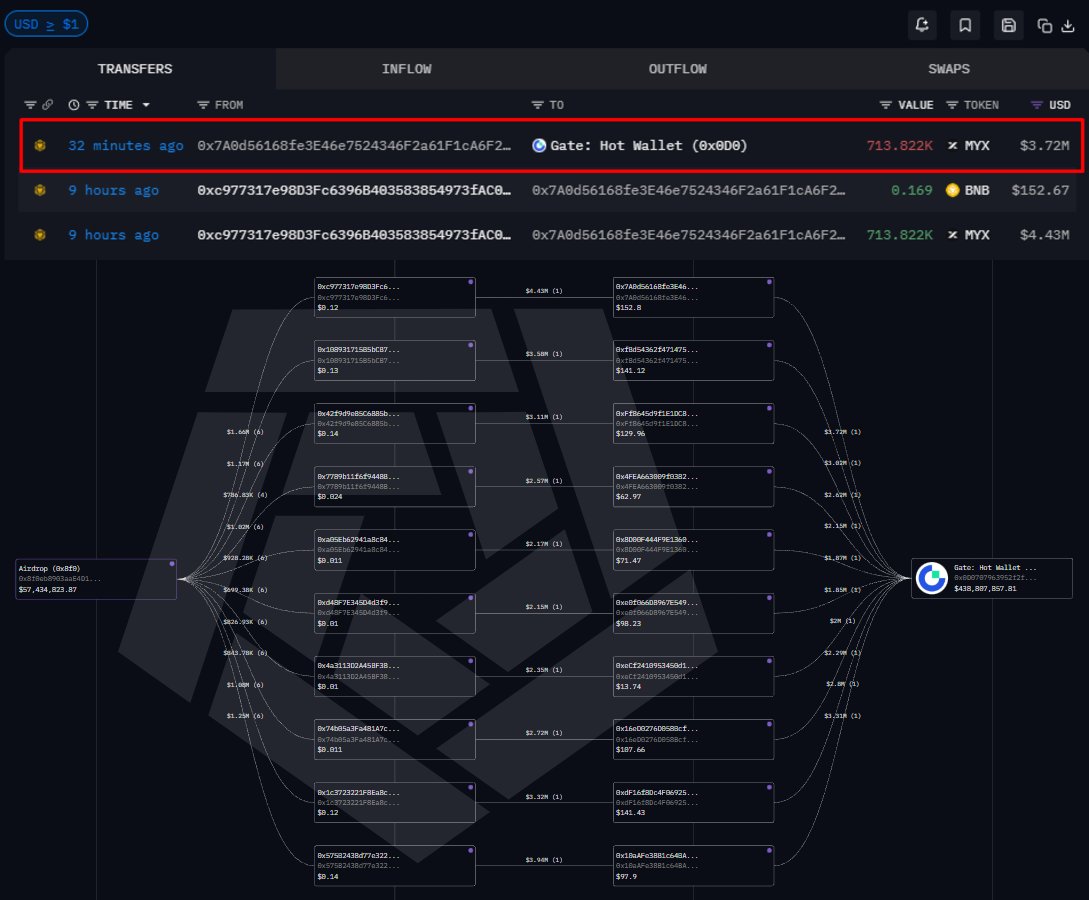 13 2 3.40K Оригінал >Тенденція MYX після випускуВедмежийLarge token outflows from MYX team/airdrop wallets to exchanges, indicating potential selling pressure.