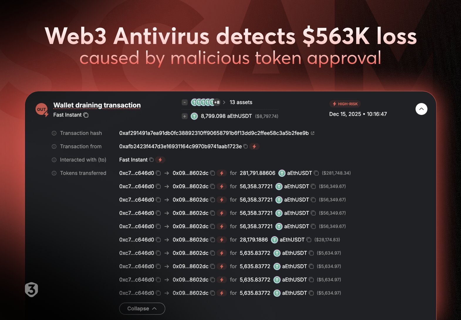 A DeFi user lost $563K while withdrawing funds from Aave and Compound after granting a malicious token permission, according to @web3_antivirus.