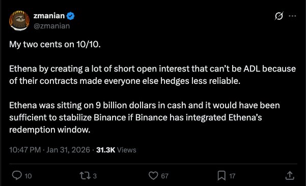 The core of the argument placing responsibility on Ethena is based on claims put forward by @zmanian (Zaki), a core contributor to Cosmos. His argument can be summarized as follows. Due to the nature of Ethena’s product — which requires maintaining a delta-neutral position — the protocol was structurally compelled to build up a large amount of short open interest in the market. The issue, according to this view, is that these short positions were structured in a way that made them ineligible for Auto-Deleveraging (ADL) on centralized exchanges (CEXs).