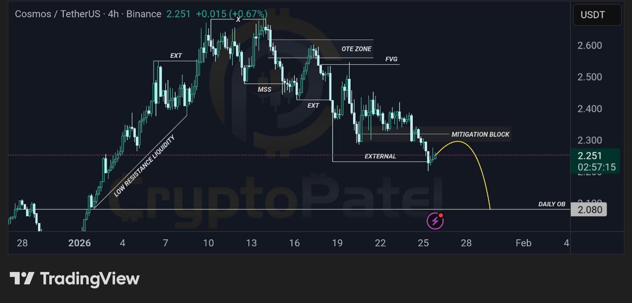 Crypto Patel 技术分析师 意见领袖 B54.66K @CryptoPatel$ATOM/USDT 4小时 空头设置 ✅ 看跌MSS已确认 ✅ 回撤进入有效缓解区 ✅ 之前的流动性已被清除 → 有利于延续 ✅ 弱反弹,未出现看涨位移 ✅ 下行流动性 = 高概率回抽 入场:$2.294 | 止损:$2.423 | 目标:$2.20 / $2.08 等待短期时间框架的拒绝/位移 在目标1处逐步获利,积极跟踪止损并耐心等待清晰的入场机会。