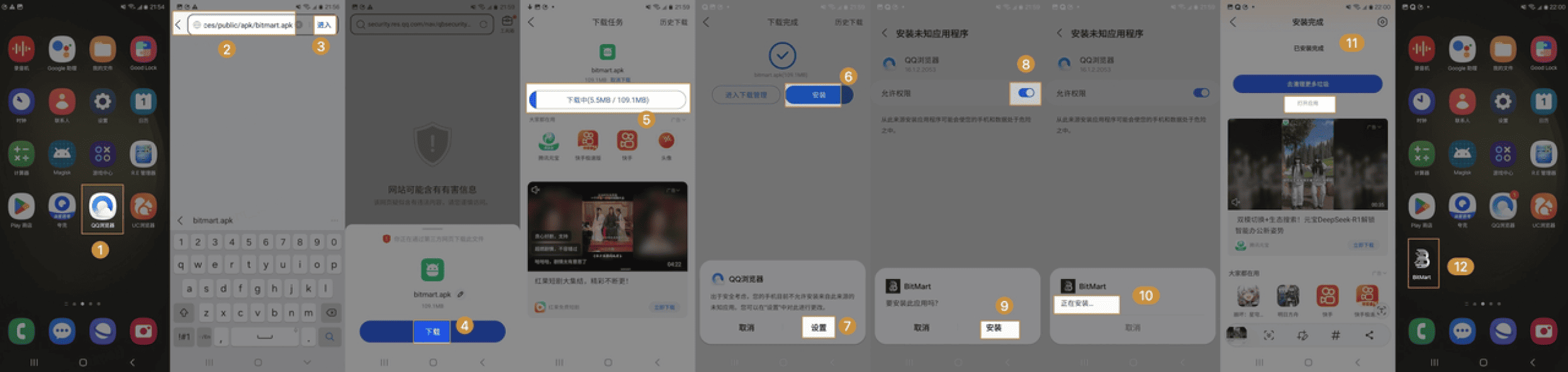 • 打开【QQ浏览器】,将【复制链接】输入到浏览器中点击【进入】进行下载,下载完成点击【安装】。如果遇到提示,则进入【设置】,打钩【允许访问】后就可以顺利安装了,最后界面上出现APP即表示安装完成。