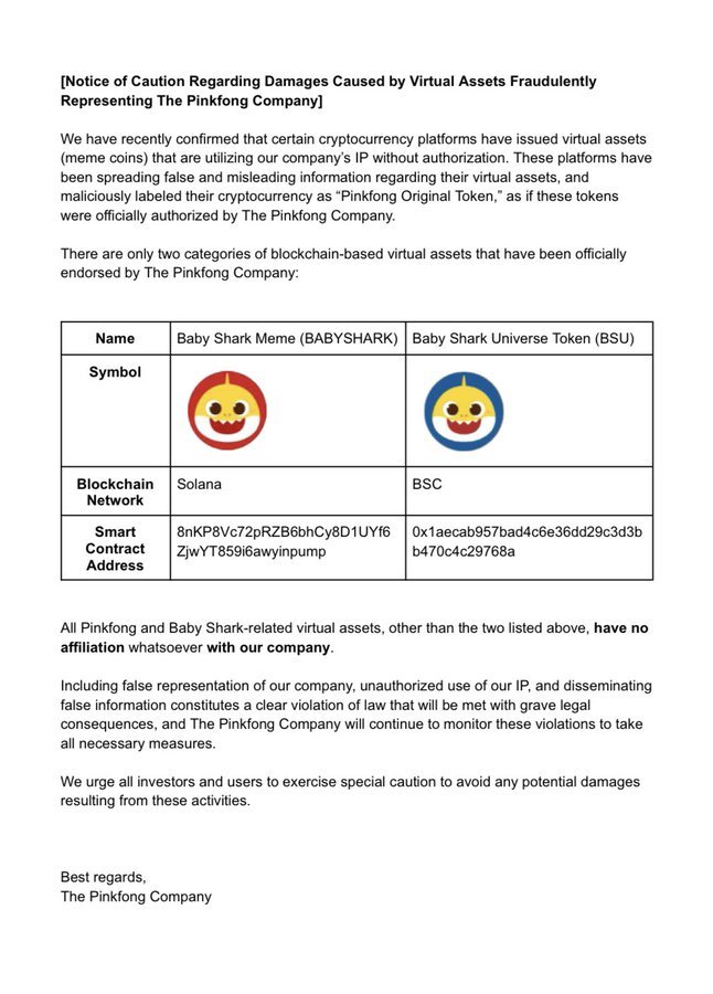 Pinkfong警告未经授权的Baby Shark迷因币存在风险,导致某代币崩盘,投资者应警惕。