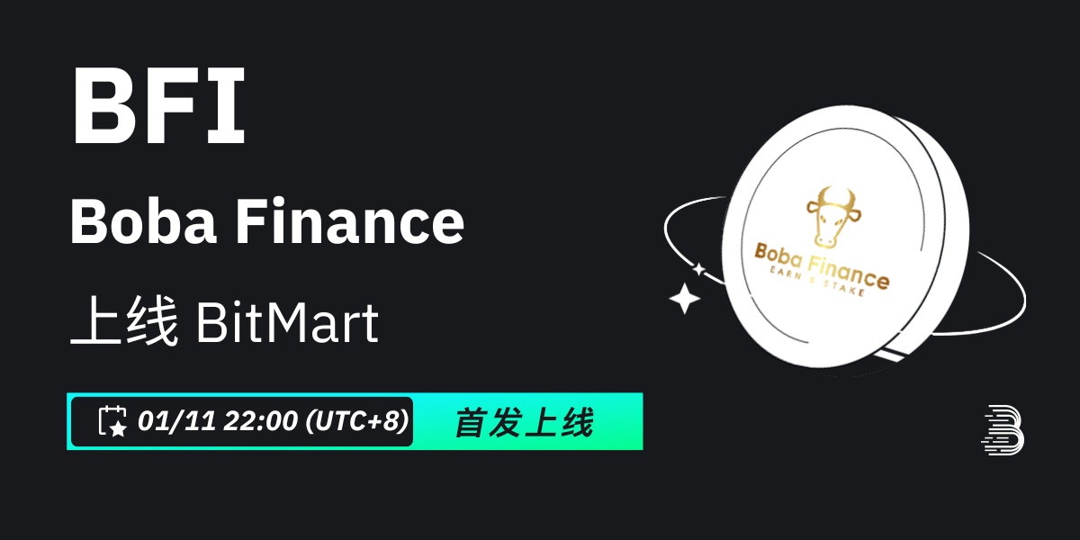 BitMart将于2024年1月11日首发上线代币Boba Finance (BFI)。届时将开通BFI/USDT交易对。其他各项功能的开放时间请参照: