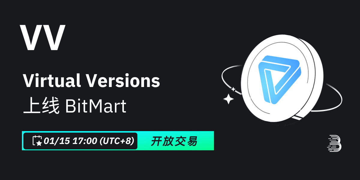 BitMart将于2024年1月15日上线代币Virtual Versions (VV)。届时将开通VV/USDT交易对。其他各项功能的开放时间请参照: