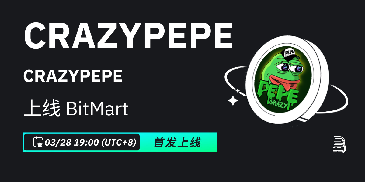 BitMart将于2024年3月28日首发上线代币CRAZYPEPE (CRAZYPEPE)。上线各项细节请参照: