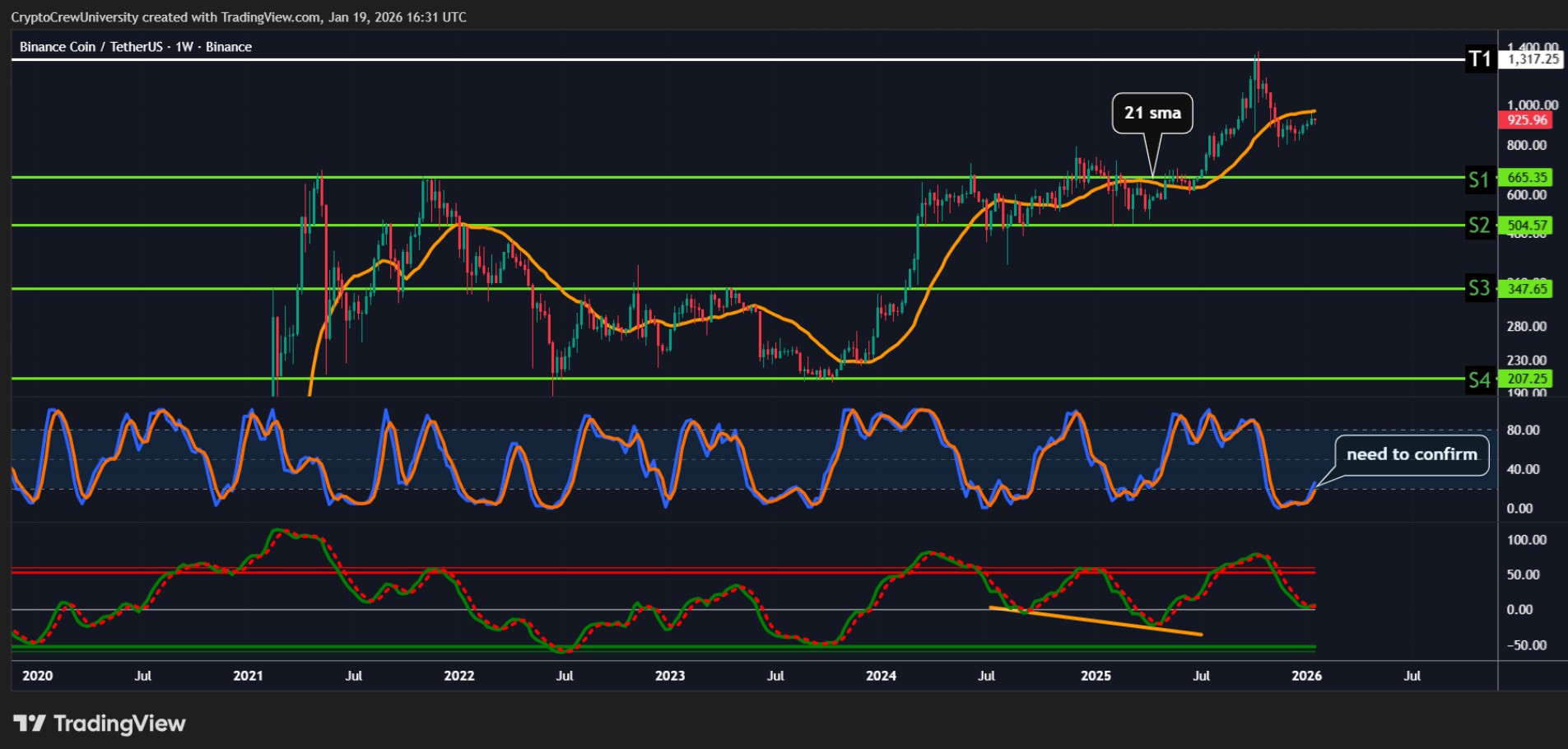 Crypto Crew University TA_Analyst Trader B87.27K @CryptoCrewU📊 #BNB Weekly Update Holding AVWAP + 50% retrace = strength vs peers🛡️ Hybrid <24 has preceded major rallies (rare signal). Key test: $990–$1100 → break opens ATH / macro Fib upside. Want the full level map & invalidation points? Join the discussion inside the FFA 👇 https://t.co/IiorHx6RC4