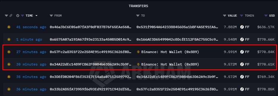 onchainschool.pro OnChain_Analyst Educator A6.03K @how2onchain$FF TEAM-LINKED WALLETS ACTIVE Over the past 30 minutes, $3M worth of $FF were transferred from 4 wallets linked to team wallets to fresh addresses So far, funds from two of these wallets have already been deposited to Binance. The remaining wallets may follow Wallets involved: 0x33b2AD5fA73959f6d93Ed921971C942df588f027 0x3D8fD0204F86f35317E14aBa0711258979283213 0x6575A07a193A67f93e23133a450B5D014c9aCF49 0x46a3bC6E05a07fA3F0dF037B76F65EAe560095B8